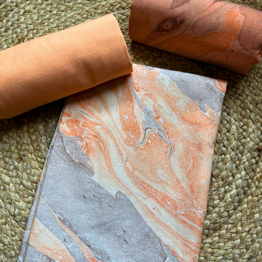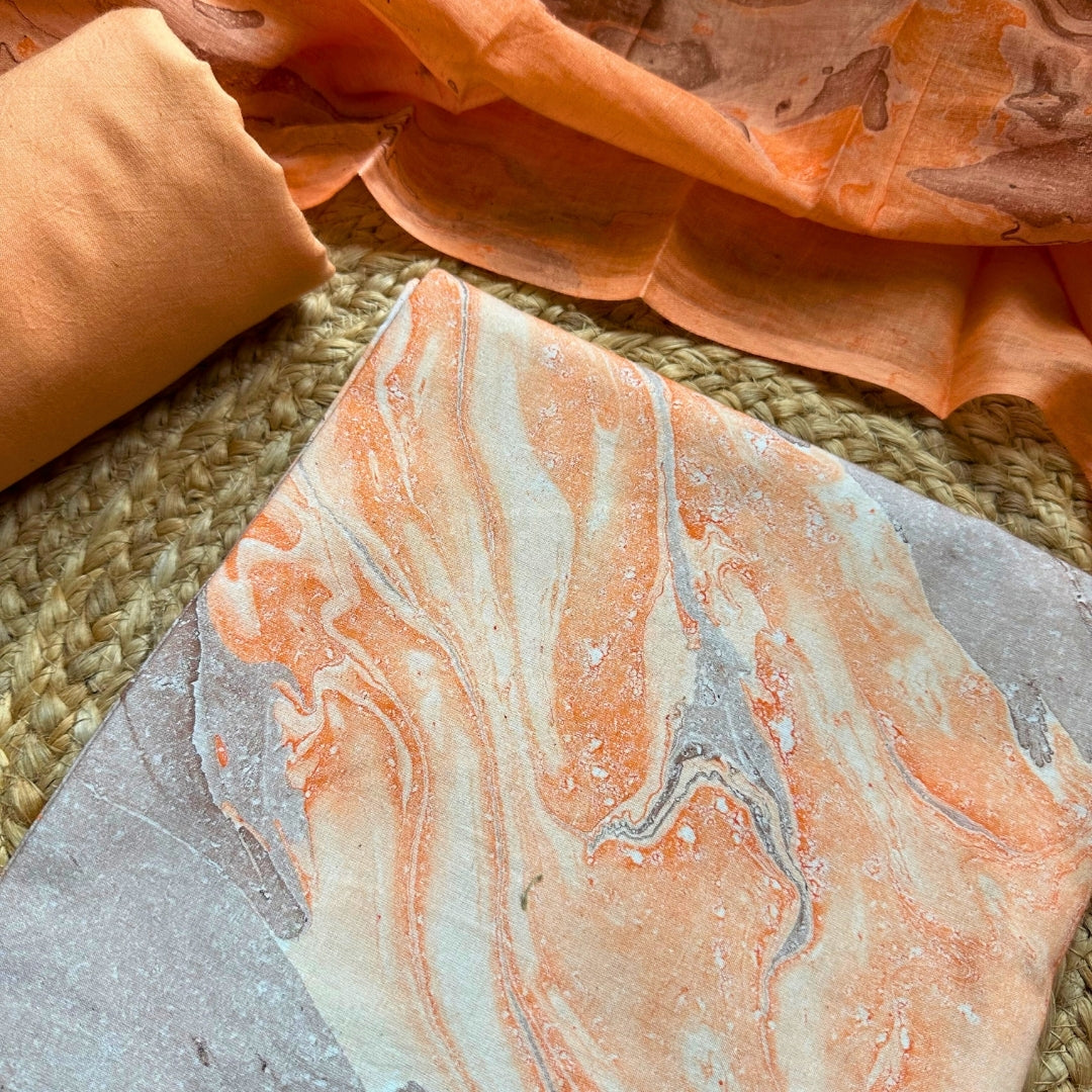 Add a splash of art to your wardrobe! This Cotton Patik Salwar Suit is a masterpiece in itself, featuring dreamy marble-effect patterns in warm orange and soft grey tones. The flow of colors gives it an artistic vibe, while the breathable cotton fabric keeps it comfy for everyday wear. A perfect pick when you want to keep it unique, light, and effortlessly stylish!