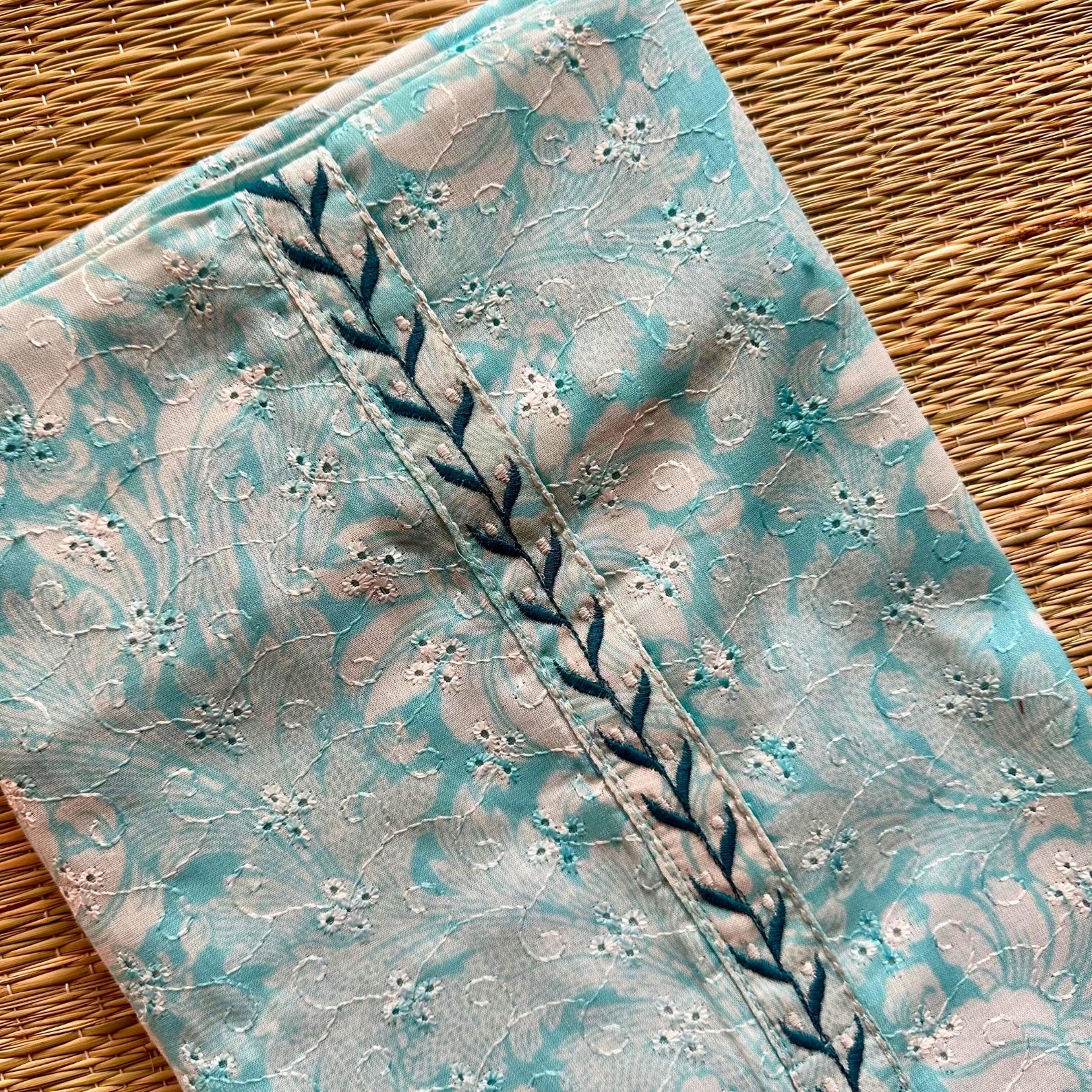 Cool, calming, and effortlessly stylish — the Aqua Serene Cotton Salwar Suit Set is a refreshing ode to simplicity and grace. The kurta features subtle floral motifs delicately highlighted with thread detailing and ladder lacework, lending an elegant handcrafted touch. The matching plain bottom and breezy dupatta complete this soothing summer ensemble that feels as light as a sea breeze.
