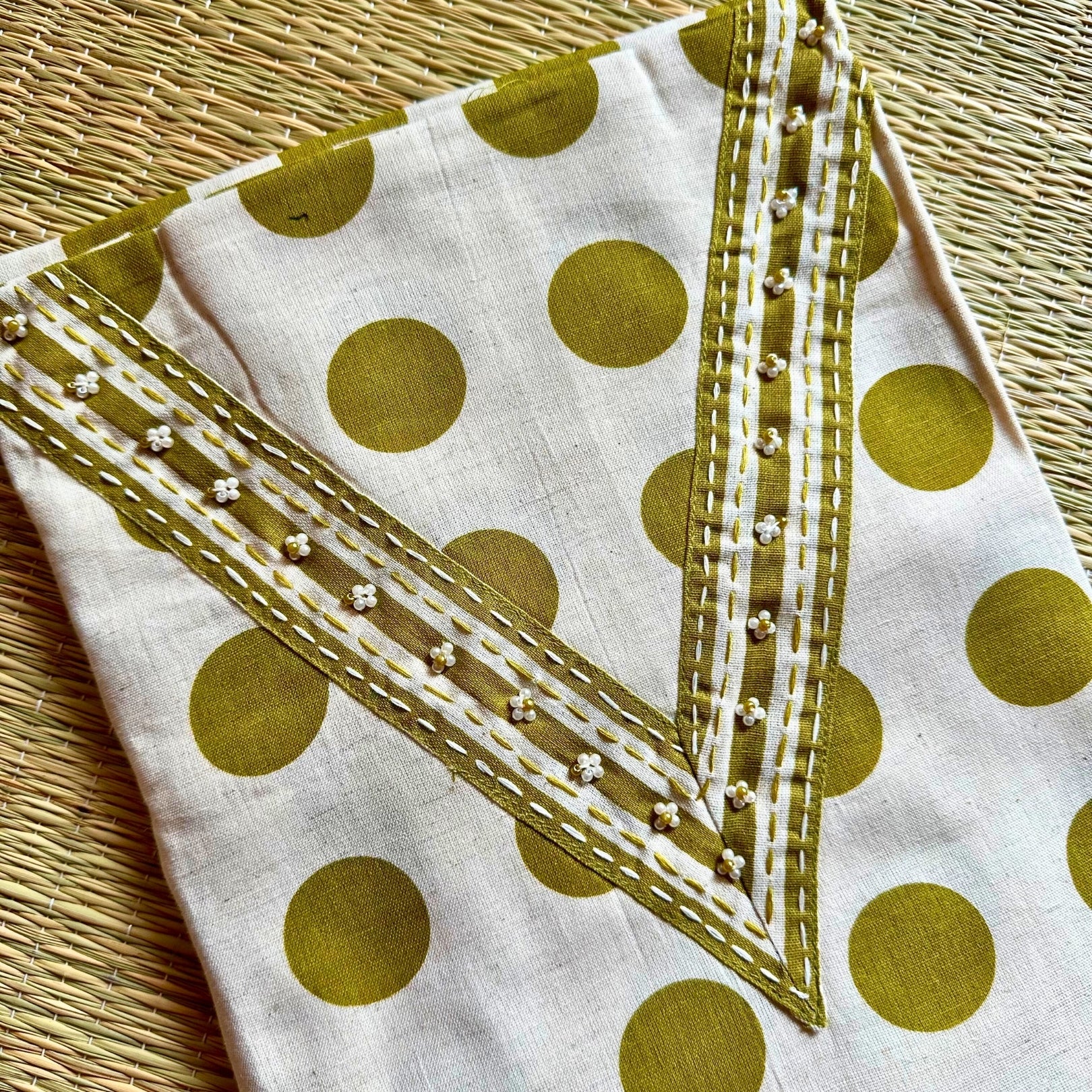 Playful yet poised — this Mustard Polka Cotton Salwar Suit Set brings together cheerful patterns and timeless grace. The kurta features bold mustard polka prints on a soothing ivory base, accentuated with delicate thread detailing along the neckline. Paired with a striped cotton bottom and a soft, tie-dyed dupatta in matching hues, this ensemble beautifully blends comfort with contemporary charm.