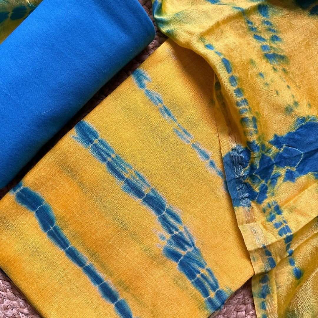 Inspired by traditional dyeing techniques, this Patik print cotton salwar suit is a vibrant burst of culture and craftsmanship. The breathable, lightweight cotton fabric ensures all-day comfort, while the bold yellow and blue hues add a lively, youthful energy — perfect for everyday styling with a twist of tradition.
