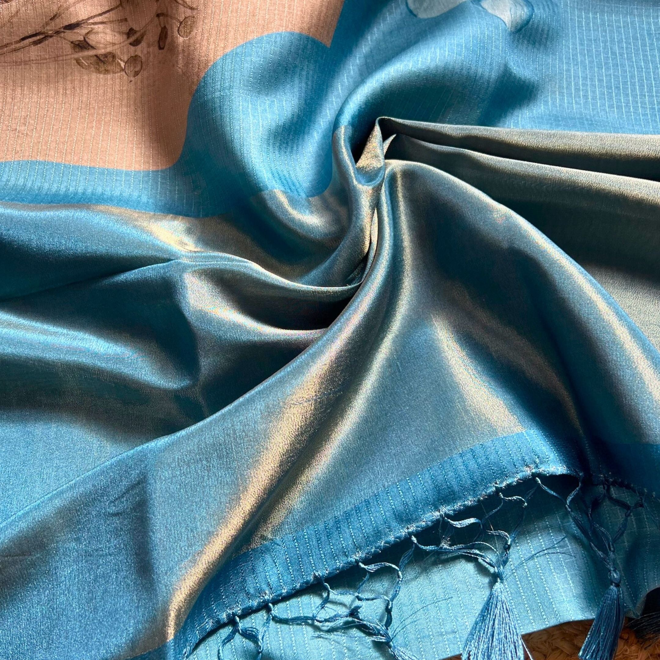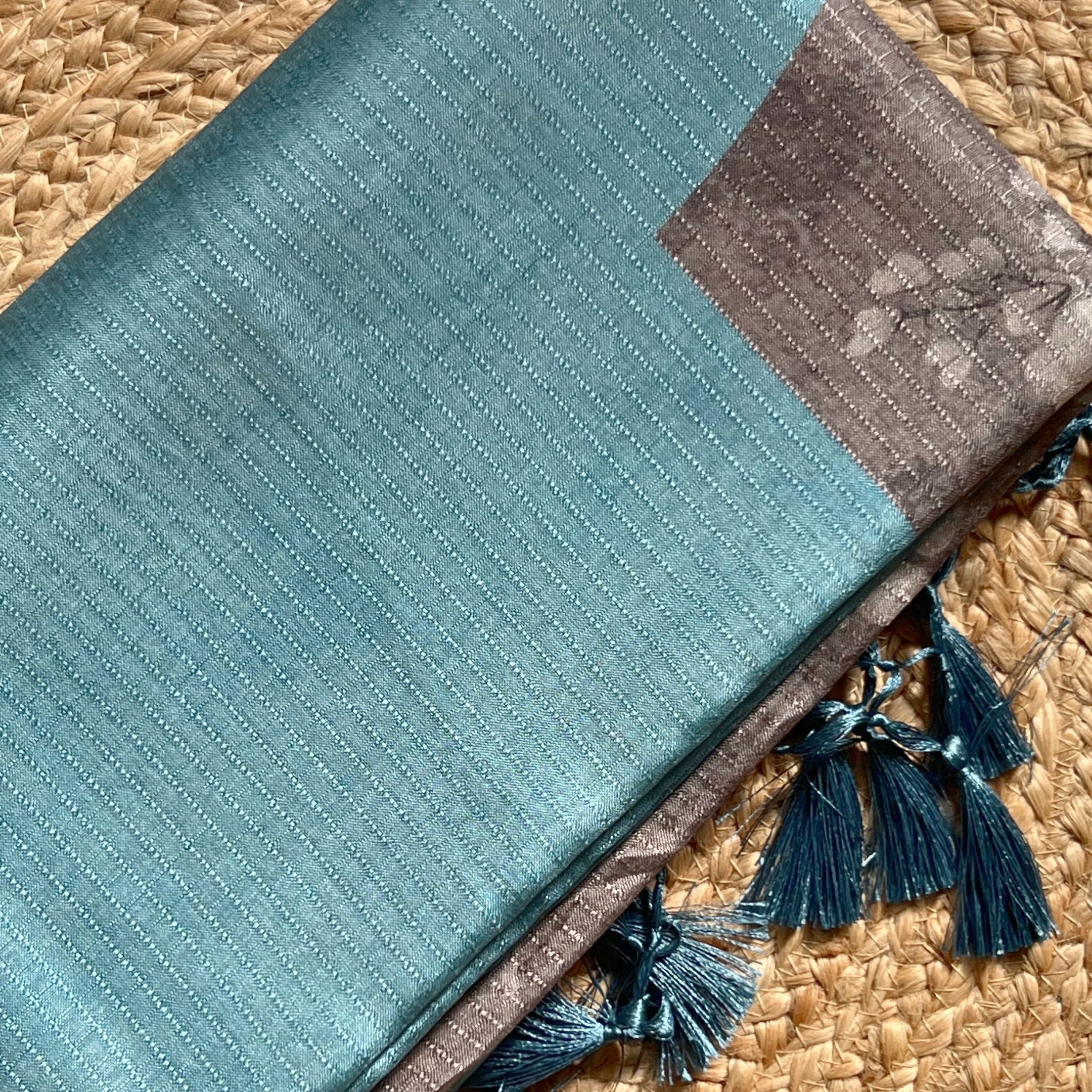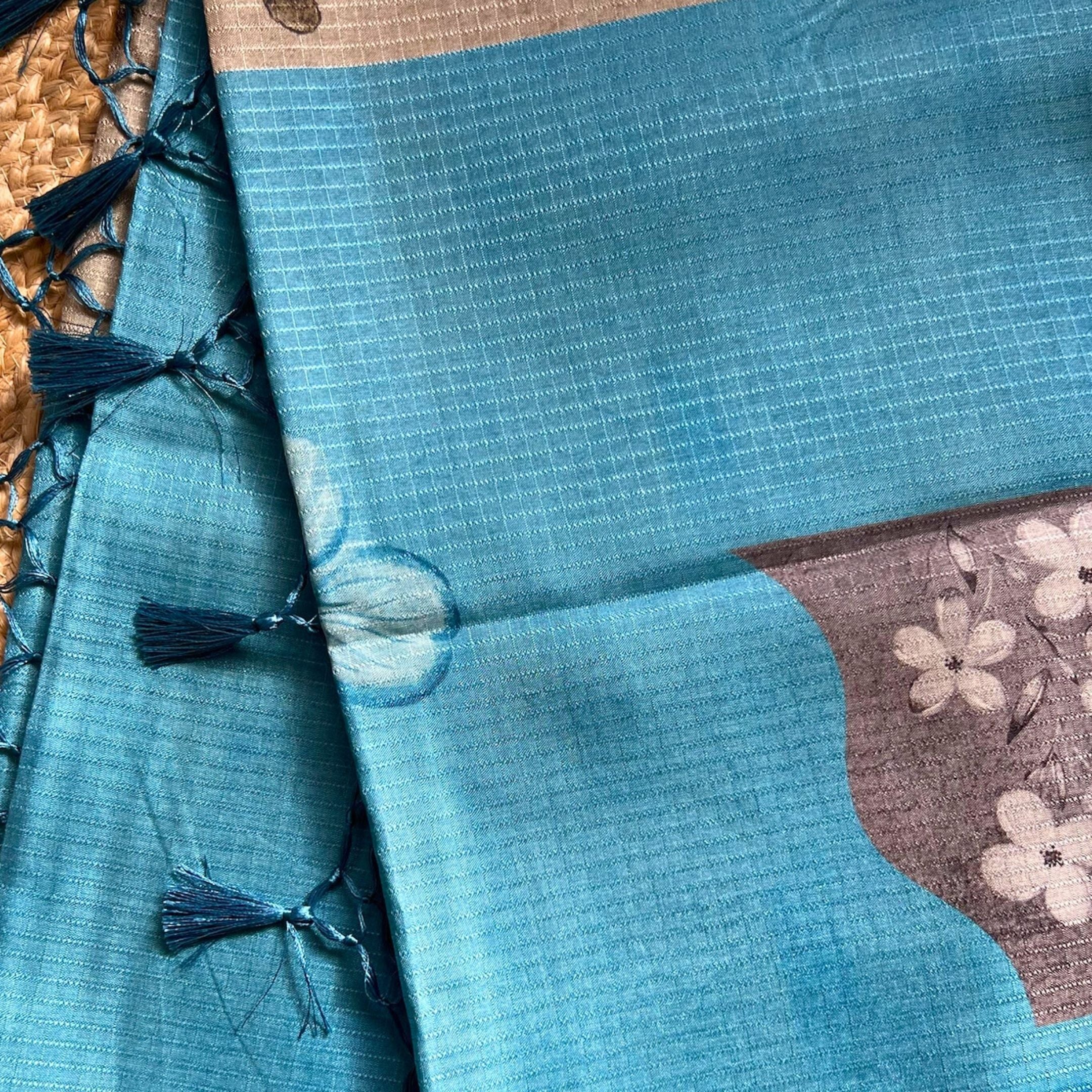 This is a Chapa Tusser saree known for its lightweight feel, natural texture, and elegant matte finish that drapes like a dream. In a calming blue hue with delicate floral designs printed across the body, this saree brings together tradition and charm with effortless grace. 🤌🏻