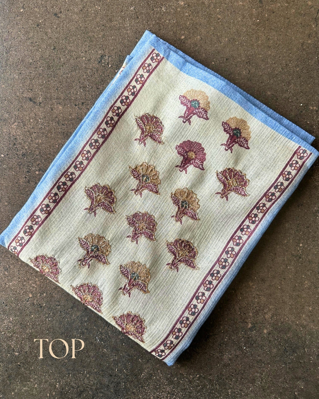 Understated beige with sky blue hues and zari accents make this linen suit a perfect blend of simplicity and festive charm.
