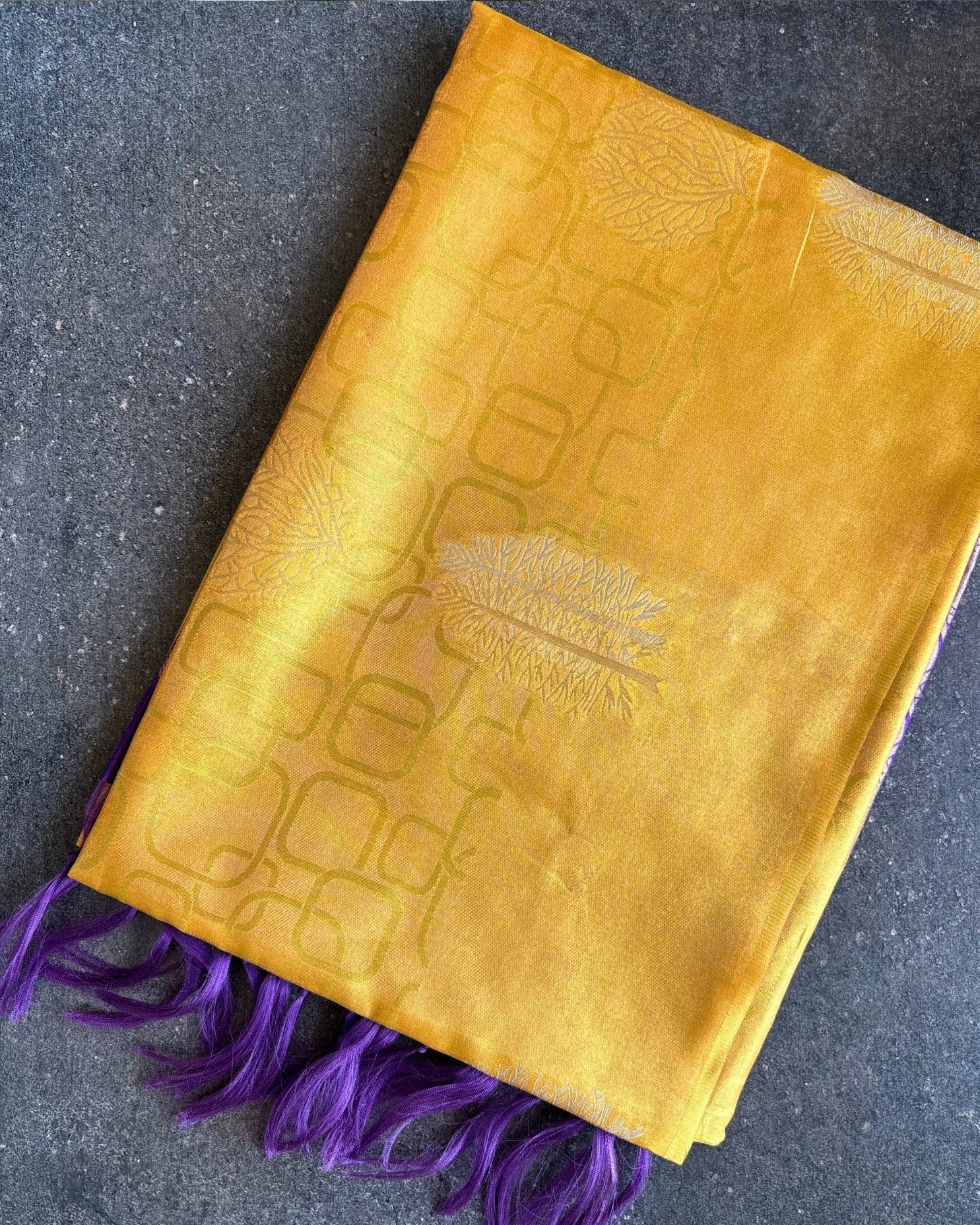 Experience the elegance of dual-toned artistry with this Yellow–Purple Semi Tussar Saree, crafted with a luxurious blend of silver and gold jari buttas. The fabric carries the natural sheen and lightweight drape of semi tussar, making it perfect for festive occasions, intimate celebrations, and timeless wardrobe styling. The handwoven buttas add depth and richness, offering a refined, understated shine that elevates the entire look. Ideal for those who love traditional weaving with a contemporary colour palette.