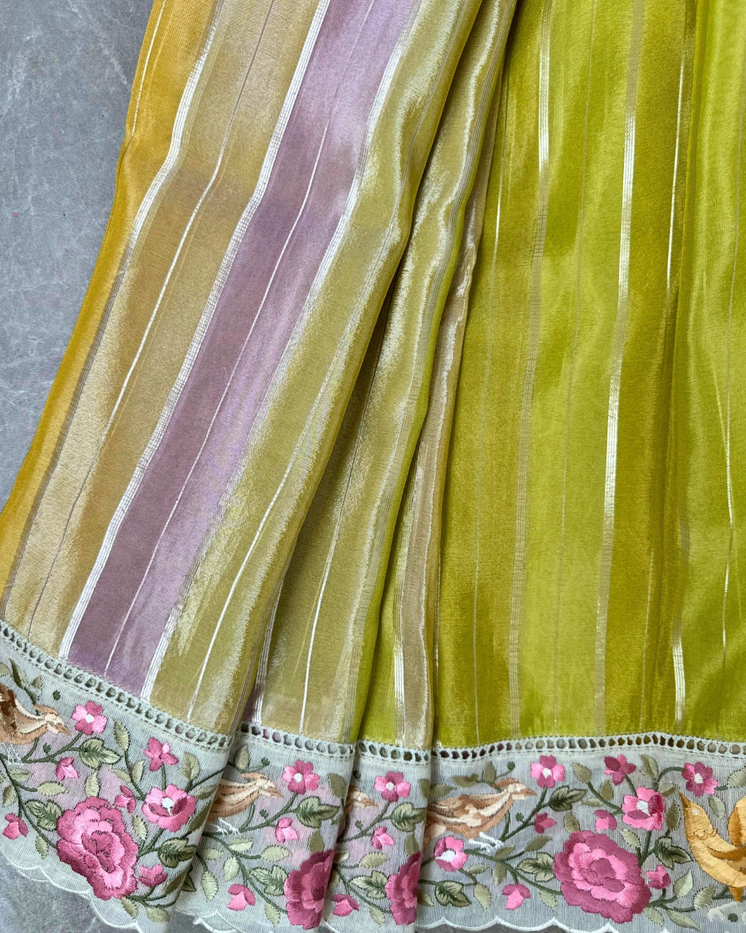 Elevate your wardrobe with our Rangat Saree, crafted with delicate Parsi-style embroidery along a striking multi-colour border. Designed to blend tradition with modern elegance, this saree features fine threadwork, smooth drape and a vibrant yet refined finish.