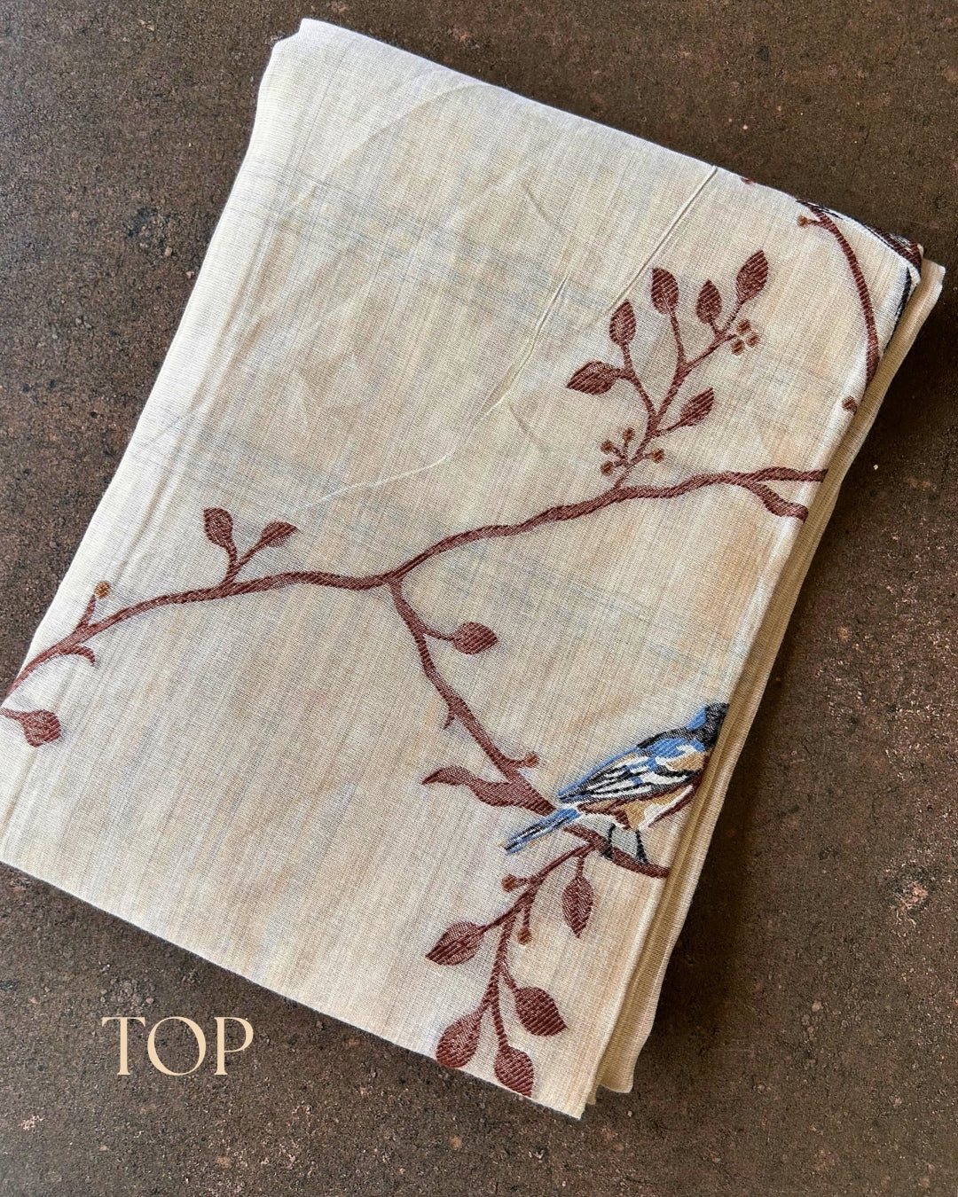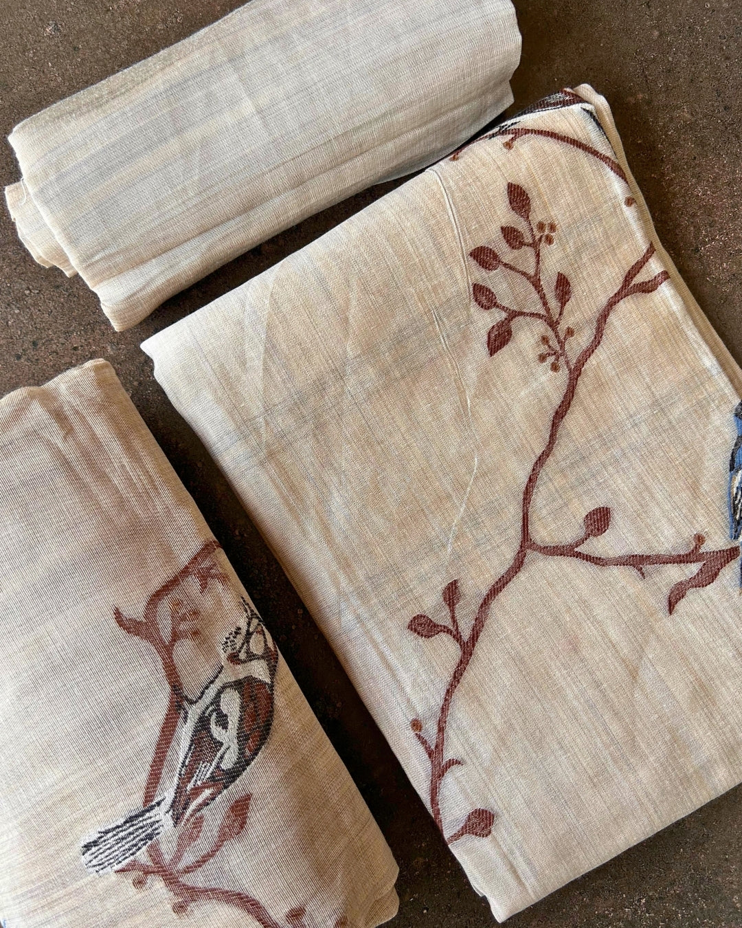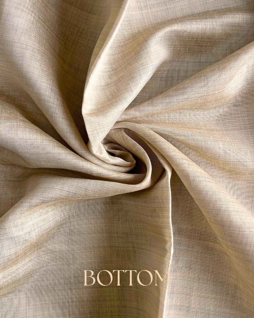 Beige meets maroon in this handwoven Chanderi ensemble, where fine threadwork enhances the natural elegance of the fabric. Ideal for those who love understated luxury.