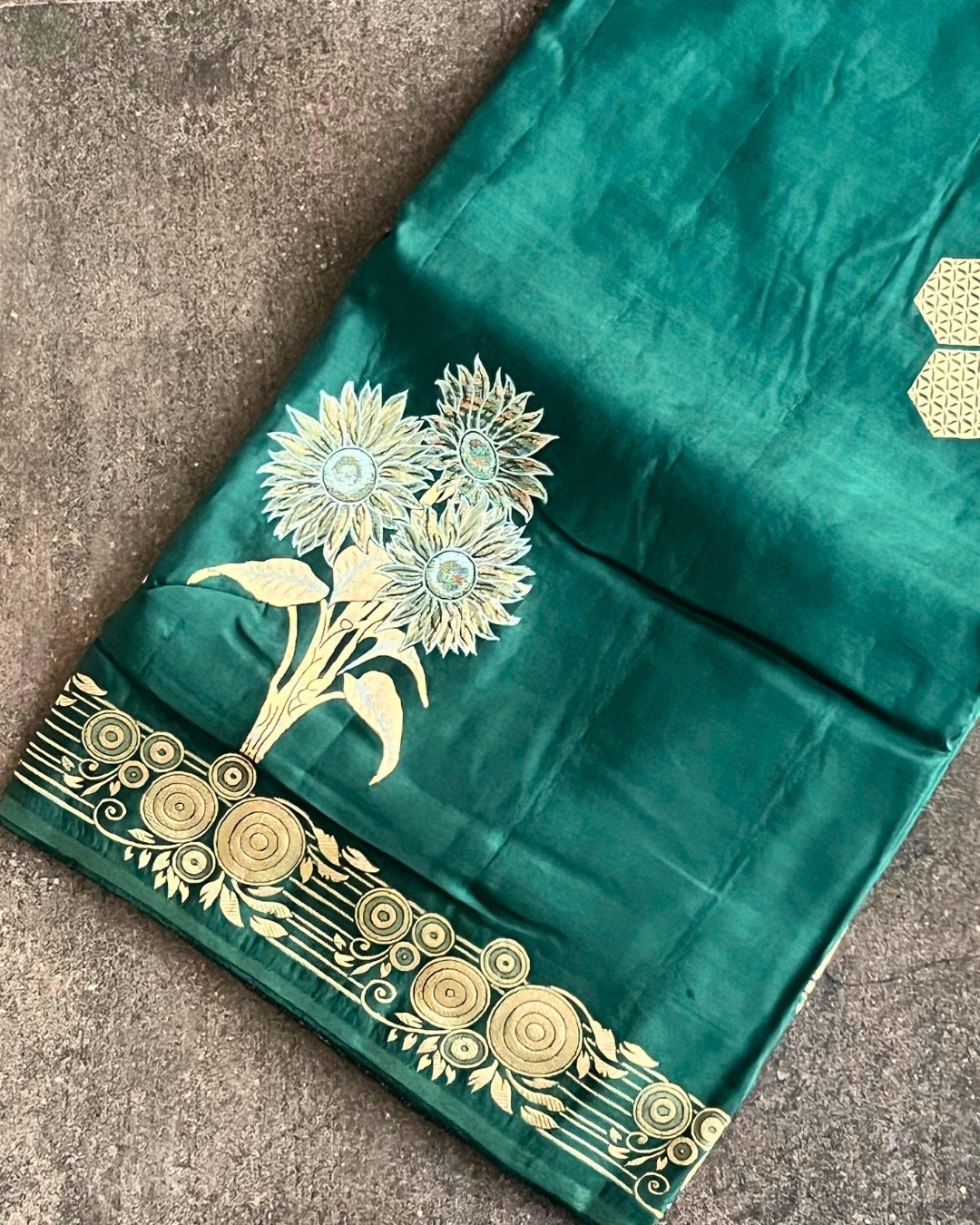 Deep emerald green dola silk with intricate gold detailing lends a regal finish. The contrast motifs and sheen make it a striking choice for traditional events.