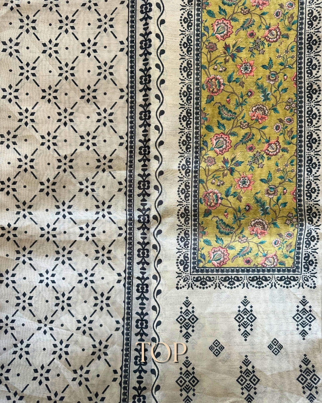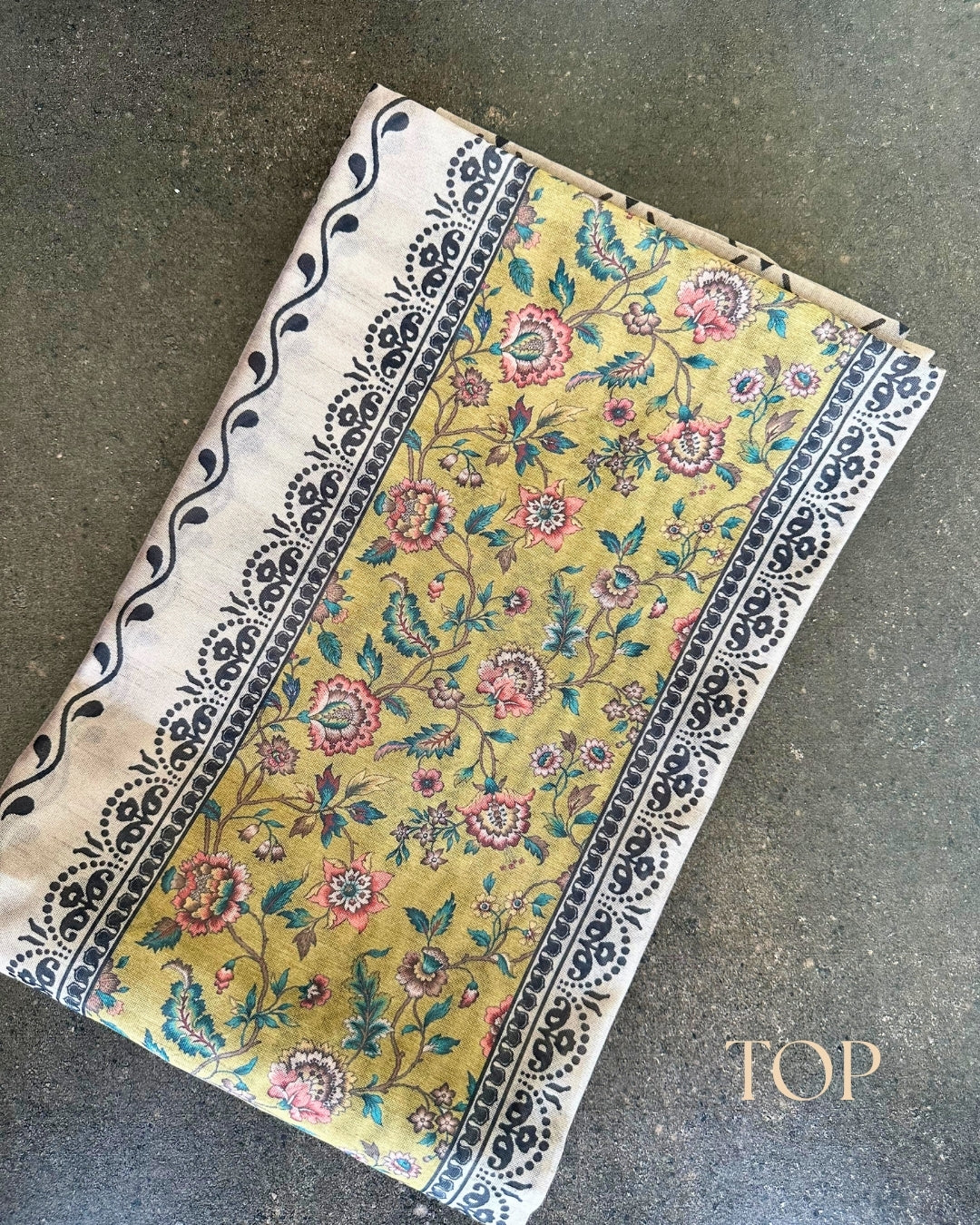 This semi-tussar suit in mustard yellow with intricate floral patterns and a contrast black-and-white border is a celebration of heritage weaving with a modern twist.
