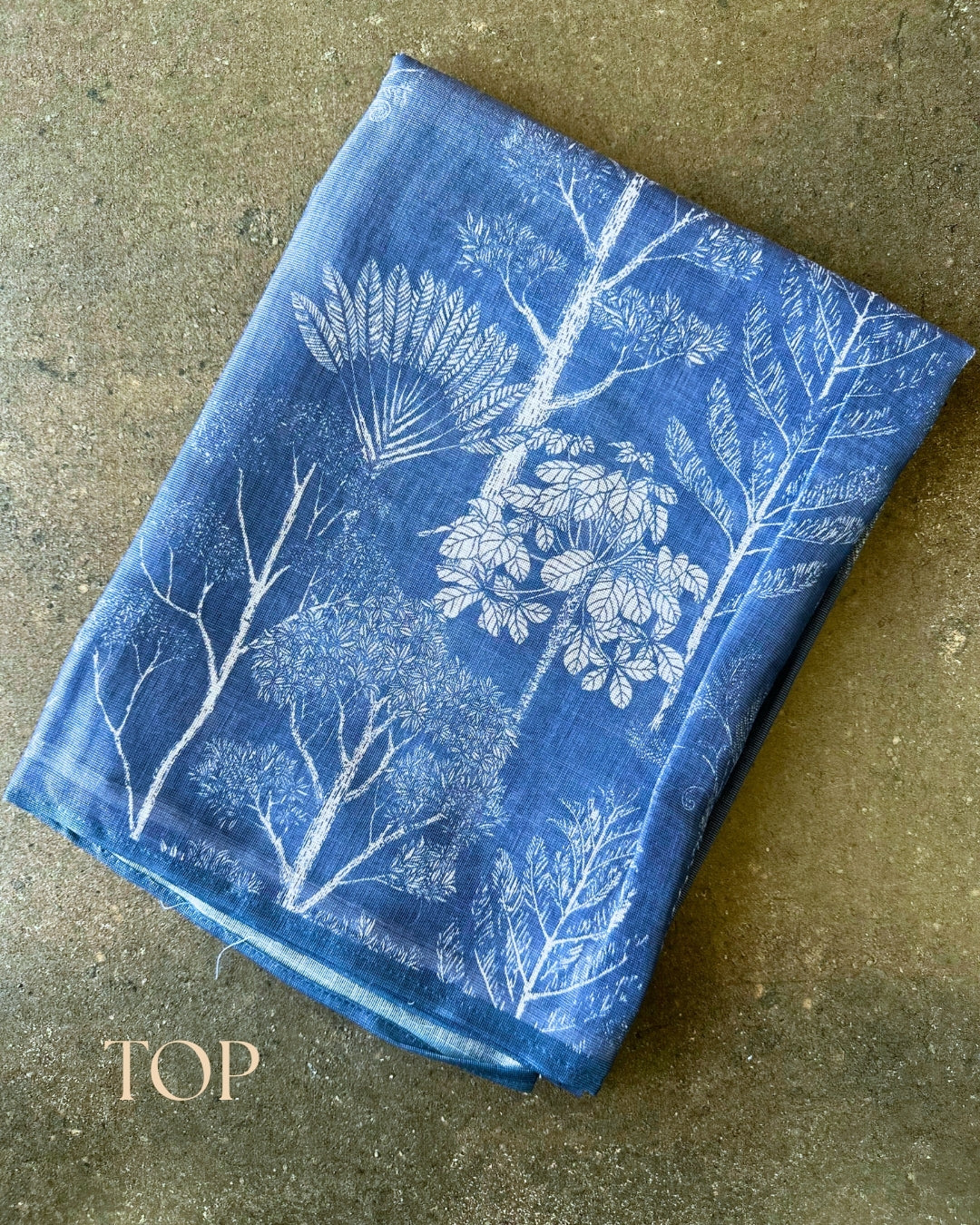 Cool sky tones with soft white motifs lend this semi-tussar suit a graceful charm that’s both comfortable and versatile.